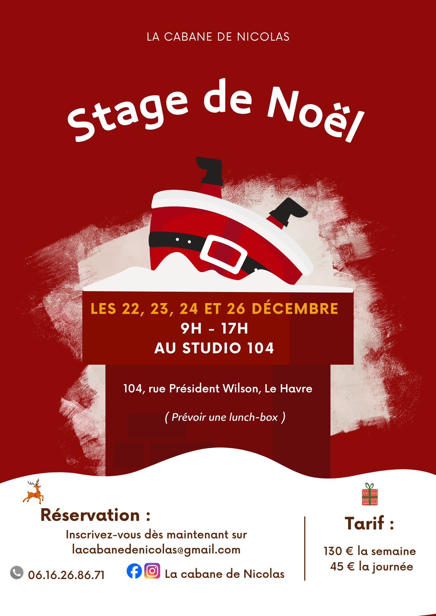 Pendant les vacances, La Cabane de Nicolas propose des stages mêlant théâtre, jeux, expression corporelle et créativité. Conçus pour les enfants à partir de 5 ans, ces moments ludiques leur permettent de s’exprimer, de s’amuser et de se faire de nouveaux amis dans un cadre bienveillant et stimulant.et même s’occuper du gâteau !