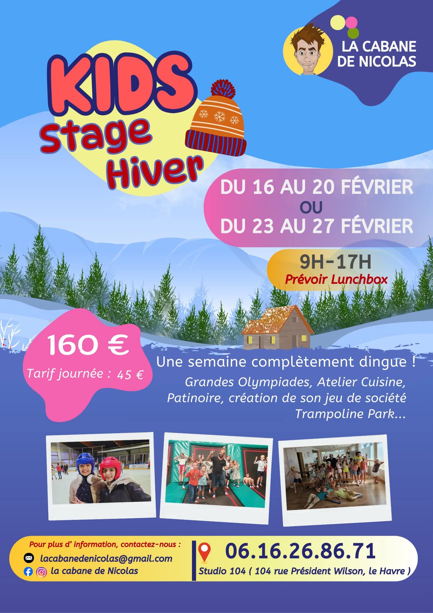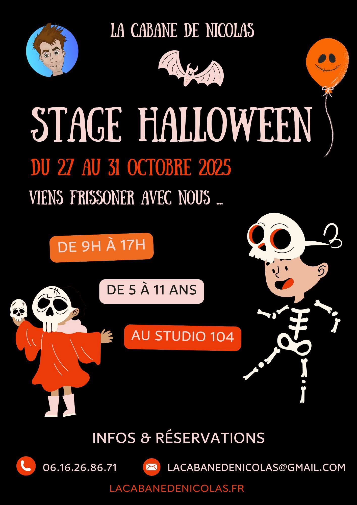 Pendant les vacances, La Cabane de Nicolas propose des stages mêlant théâtre, jeux, expression corporelle et créativité. Conçus pour les enfants à partir de 5 ans, ces moments ludiques leur permettent de s’exprimer, de s’amuser et de se faire de nouveaux amis dans un cadre bienveillant et stimulant.et même s’occuper du gâteau !